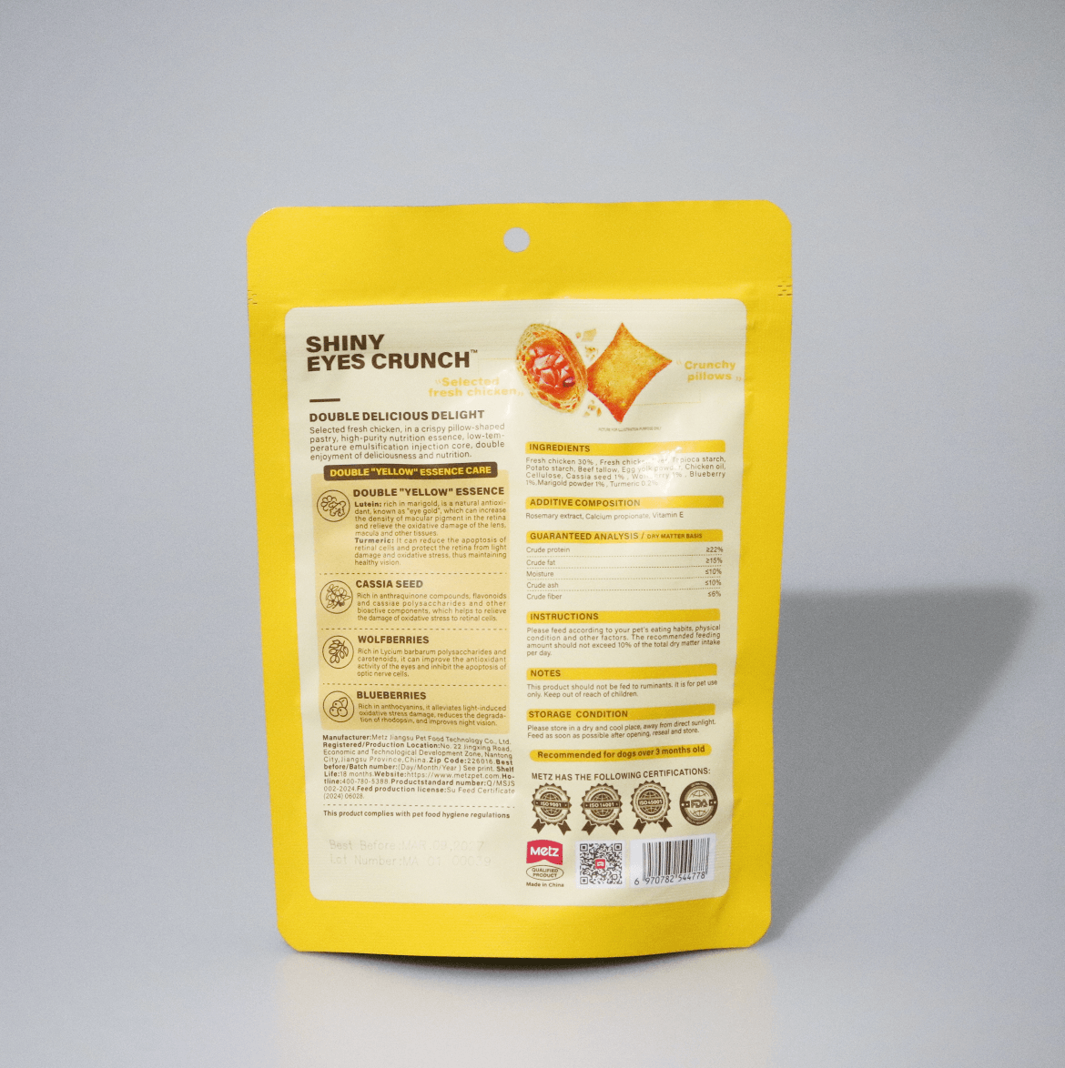 The METZ Shiny Eyes Crunch treats are a wholesome and delicious reward for your dog, featuring a satisfying Fresh Chicken flavor and a light, crunchy shell. These unique dog treats are more than just a snack; they are specially designed to promote optimal visual health.