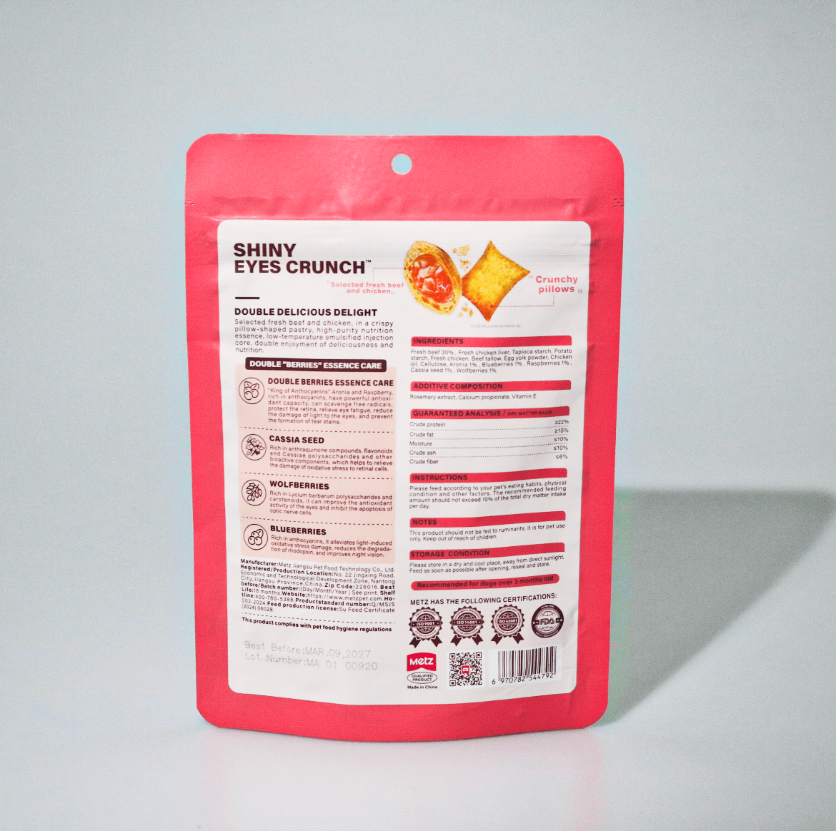 The METZ Shiny Eyes Crunch Dog Treats offer a dual benefit: a delicious reward and advanced eye nutrition. Featuring a crispy shell and a soft, creamy core, these pillows are made with premium Fresh Beef and Chicken for irresistible flavor.